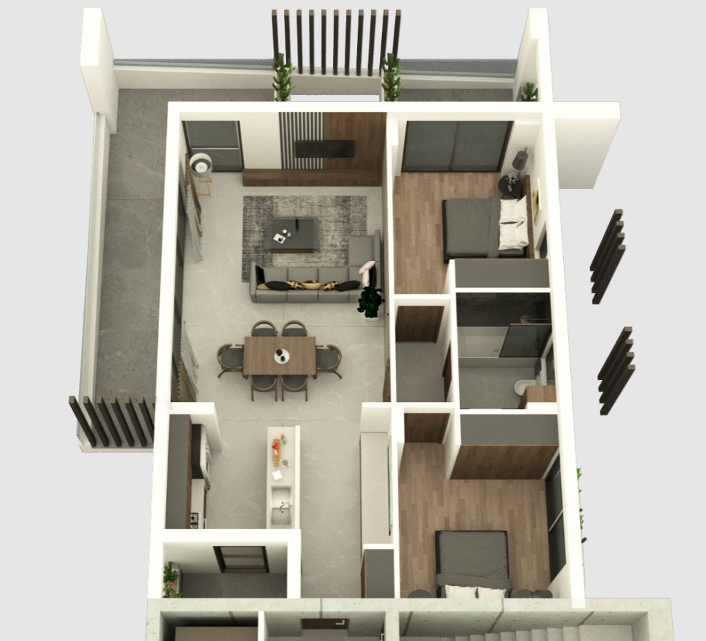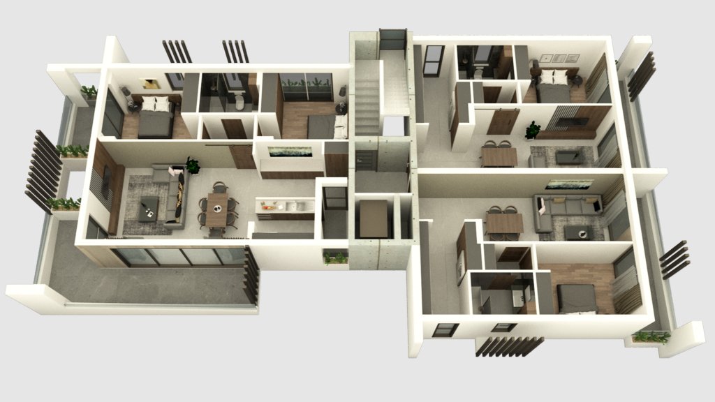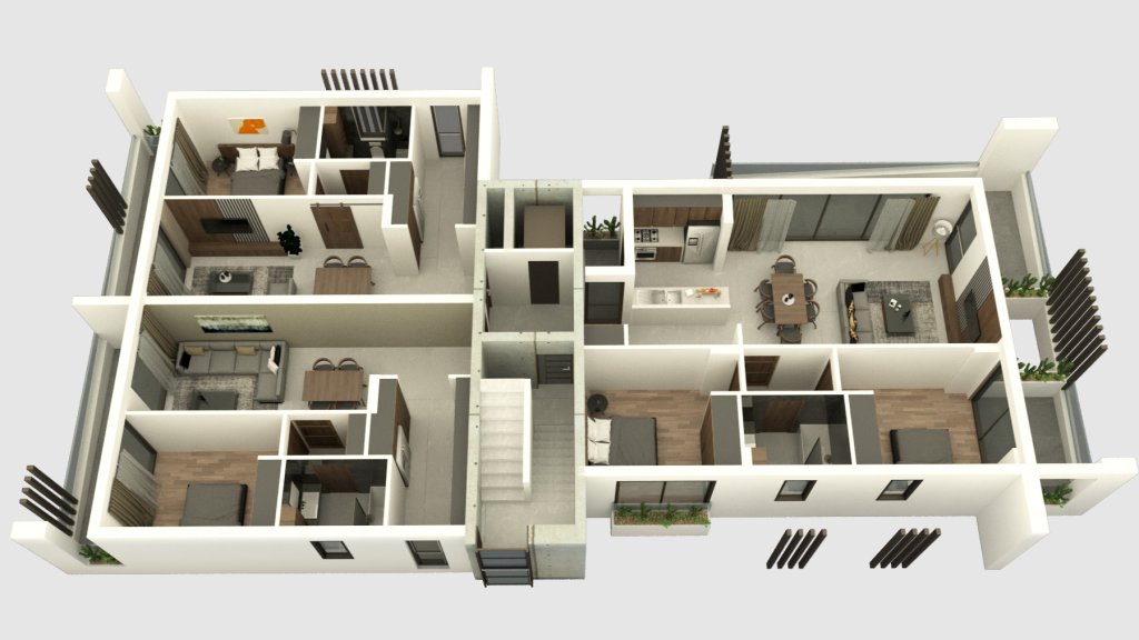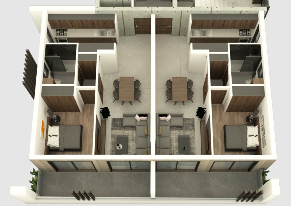 The first, the second, and third floors host one, two, and three-bedroom apartments consecutively. The fourth floor hosts a two-bedroom apartment and a three-bedroom home that measures 118 m² total internal area.