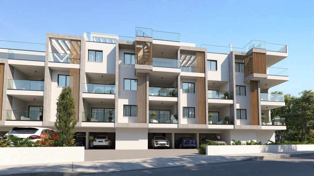 The apartment features two spacious bedrooms, an open-plan kitchen and living area, a covered veranda and two modern bathrooms. Added benefits include covered parking, a private storage room, and access to a common swimming pool, perfect for warm Cyprus days.