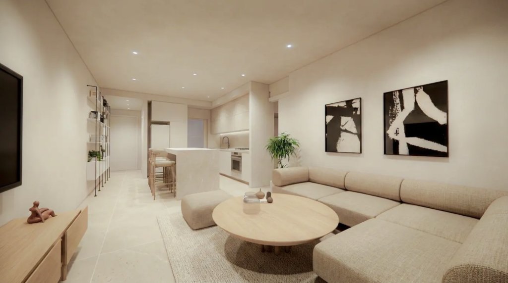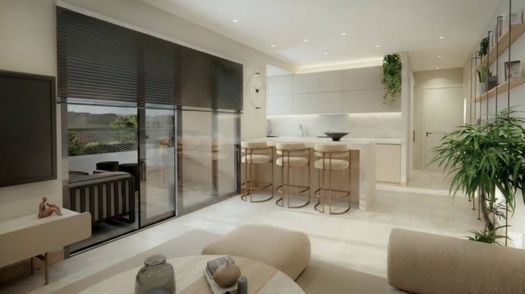 The residence features an expansive open-plan kitchen and living area, flowing onto two private balconies with large windows that flood the space with natural light. The layout includes two spacious bedrooms with electric shutters and two modern bathrooms. Built for year-round comfort, the property includes underfloor heating and A/C provisions, powered by high-efficiency PV Solar Panels. Residents also benefit from a shared swimming pool, a private storage room, a dedicated parking space, and a car charging point provision.