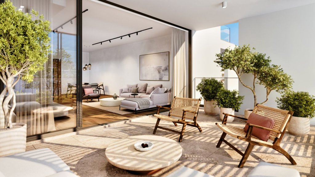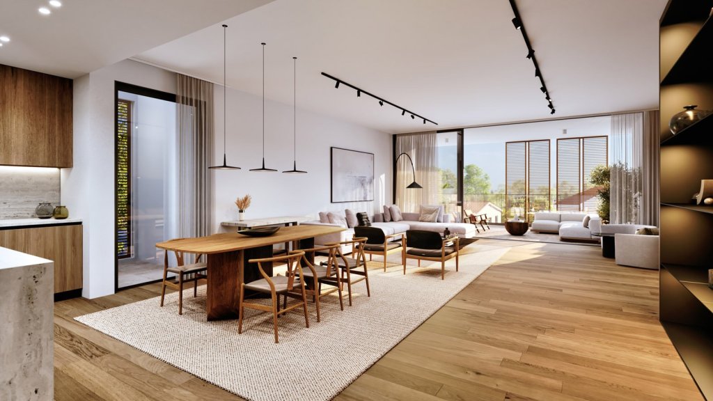 It includes an open-plan, fully fitted kitchen with a spacious living/dining area, extended to a covered veranda, and a large roof garden.
