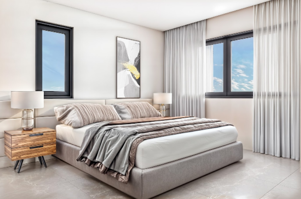 This high-end apartment features contemporary architecture with sleek lines and premium materials, designed to maximize both comfort and style. Spacious open-plan living and dining areas are complemented by high ceilings and expansive windows that frame views.