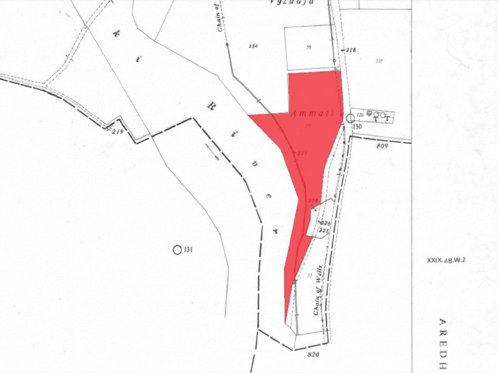 The field has an irregular shape and a slightly inclined surface, providing a natural landscape ideal for agricultural or conservation purposes. It abuts a public registered road along its eastern boundary (Kyriakou Matsi Street and Agios Markos Street), with a generous frontage of approximately 250 meters, ensuring excellent accessibility.